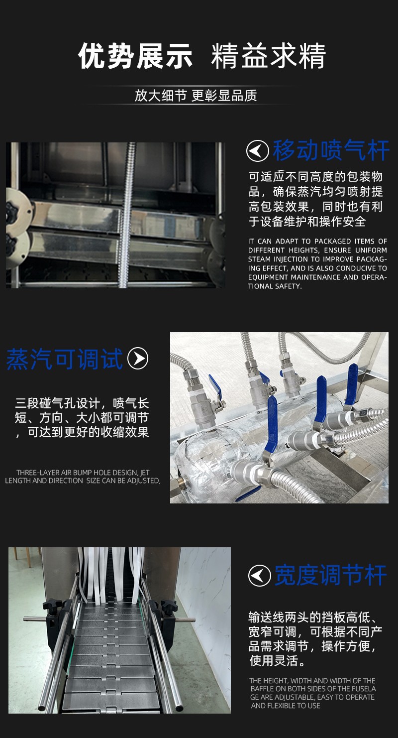 - 加熱效果優越:利用蒸汽恒溫且溫度擴散均勻的特性工作,能達到普通電熱紅外加熱收縮機不可比擬的效果。設備采用加熱器加熱水產生蒸汽,無需另外配備蒸汽鍋爐。主機有主副 2 個加熱器,可根據生產速度調節功率大小,輸送帶采用無級調速,輸送速度可任意調節。