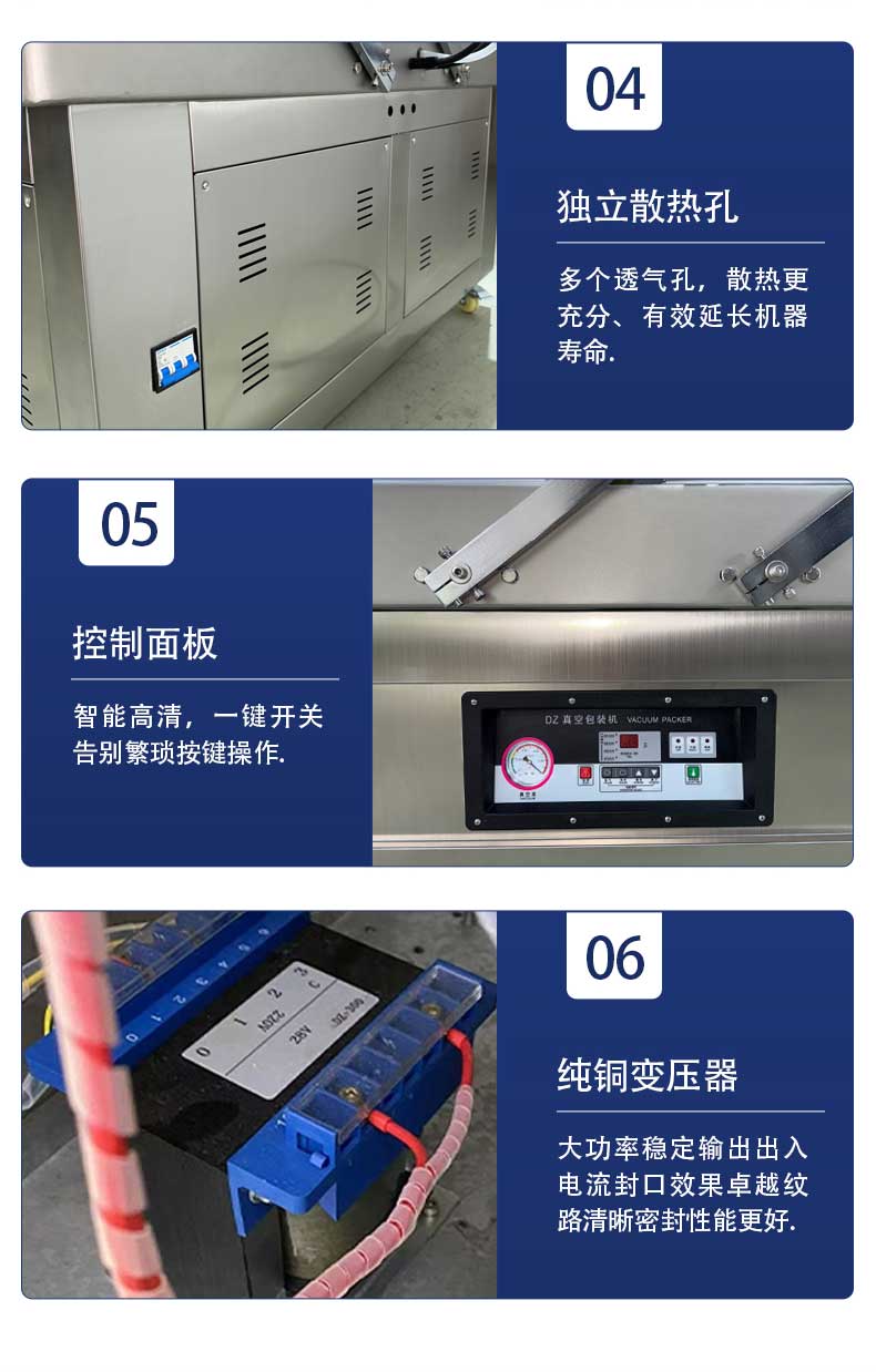 - 回氣與開蓋:當達到設定熱封時間時,熱封指示燈熄滅,真空室經電磁閥進入大氣,直至機蓋自動抬啟,取出包裝好的產品,完成一次包裝循環。