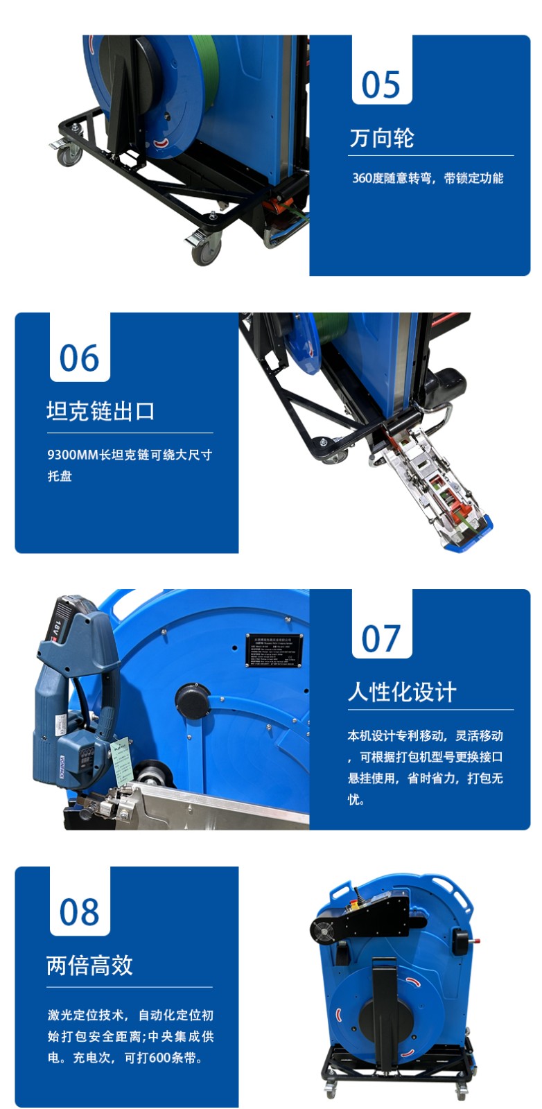 • 導向系統:由多個導向輪和導軌組成。導向輪一般是可以靈活轉動的滾輪,它們可以根據打包帶的寬度和穿帶路徑進行調整。導軌則是為打包帶提供了一個固定的通道,確保打包帶沿著預定的路線行進。比如,當打包帶需要轉彎時,導向輪會將其引導到合適的軌道上。