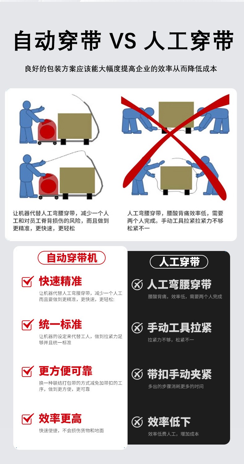 • 提高效率:相比人工穿帶,穿帶機可以大大加快穿帶的速度。尤其是在批量包裝的情況下,它可以在短時間內完成大量的穿帶任務。例如,在一個繁忙的物流倉庫,穿帶機每小時可以完成數百個包裹的穿帶工作,而人工穿帶可能只能完成幾十個。