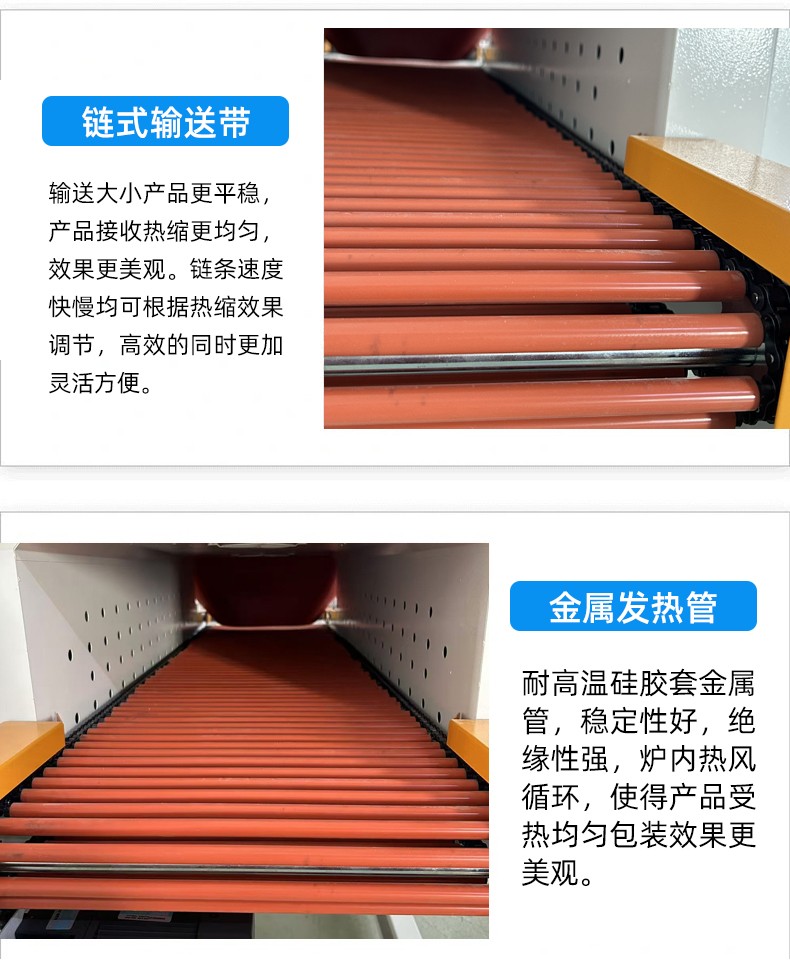 - 熱收縮效果佳:熱收縮通道內的溫度分布均勻,熱風循環系統設計合理,可使塑料薄膜均勻收縮,緊密貼合產品,展現產品的外觀特征,同時起到防潮、防塵、防碰撞等保護作用。