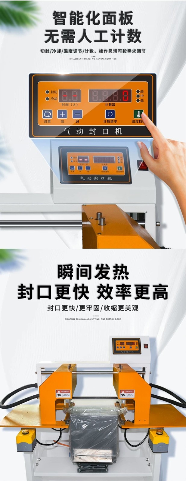 - 封口原理:通過氣動裝置產生壓力,將待包裝物品的塑料薄膜袋口部位壓緊,然后利用加熱元件對袋口進行加熱,使薄膜受熱熔化,在壓力作用下實現封口。