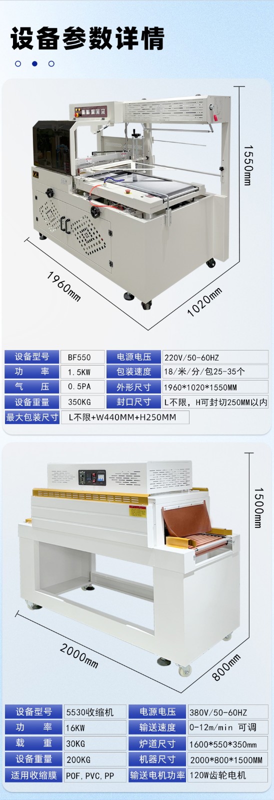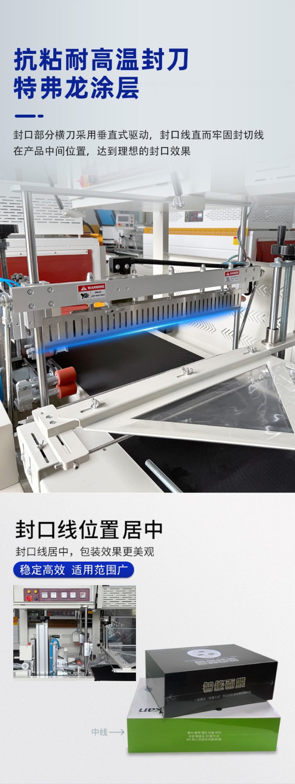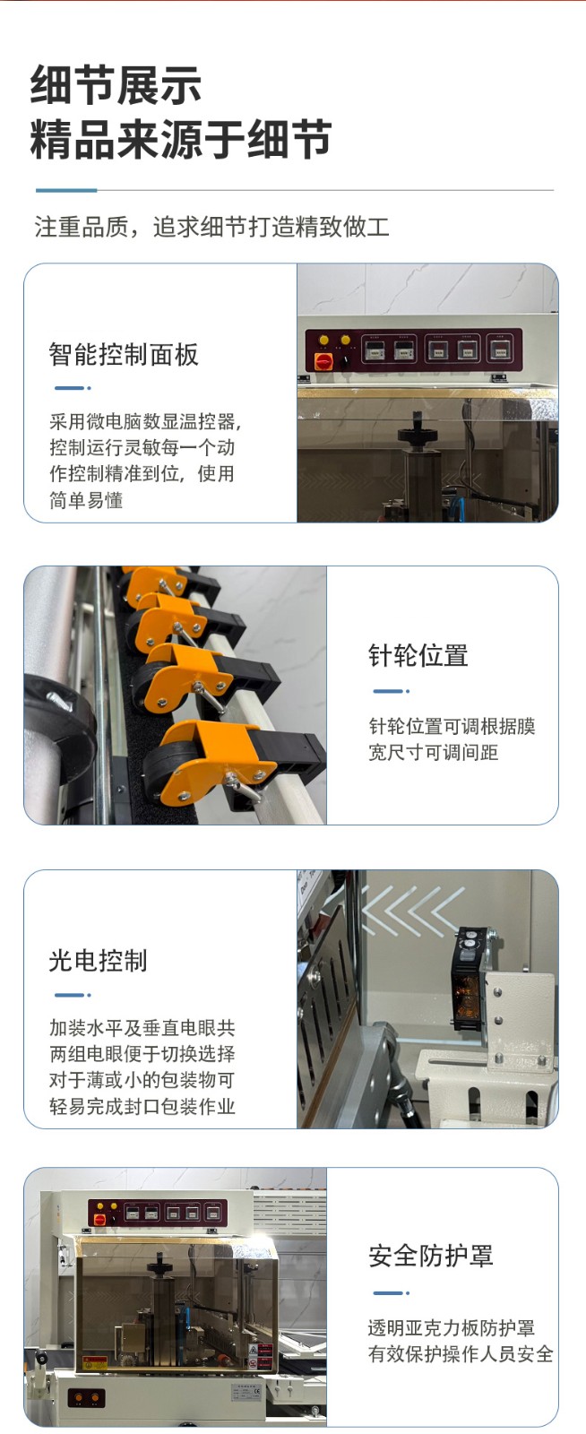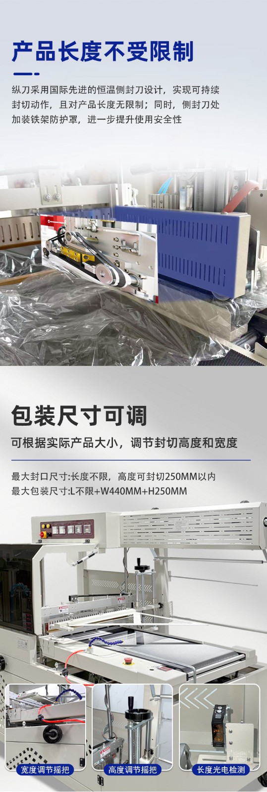 • 適用范圍廣4:邊封設(shè)計(jì)的包裝機(jī)可包裝長度不限的產(chǎn)品,通過調(diào)整還能適應(yīng)不同寬度、高度的產(chǎn)品包裝,可用于 POF、PVC 等多種熱收縮膜,能滿足食品、電子、醫(yī)藥、日化等多個(gè)行業(yè)的包裝需求。
