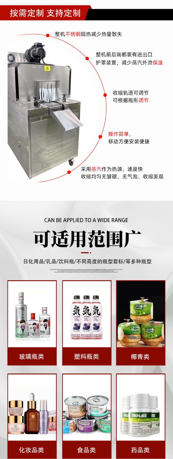 蒸汽的恒溫(通常溫度可控范圍 50-120℃)和擴(kuò)散均勻性,能避免傳統(tǒng)熱風(fēng)加熱導(dǎo)致的 “薄膜起皺、局部破裂” 問題,即使是異形產(chǎn)品(如不規(guī)則五金件、弧形瓶身),也能實(shí)現(xiàn)平整、無氣泡的收縮效果。 - 生產(chǎn)效率高:適配大規(guī)模量產(chǎn)需求