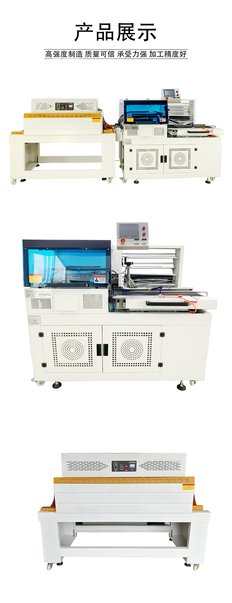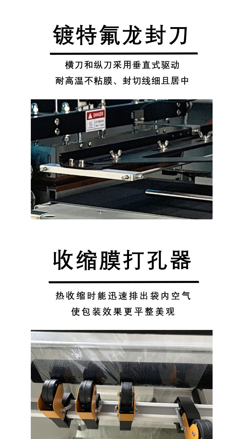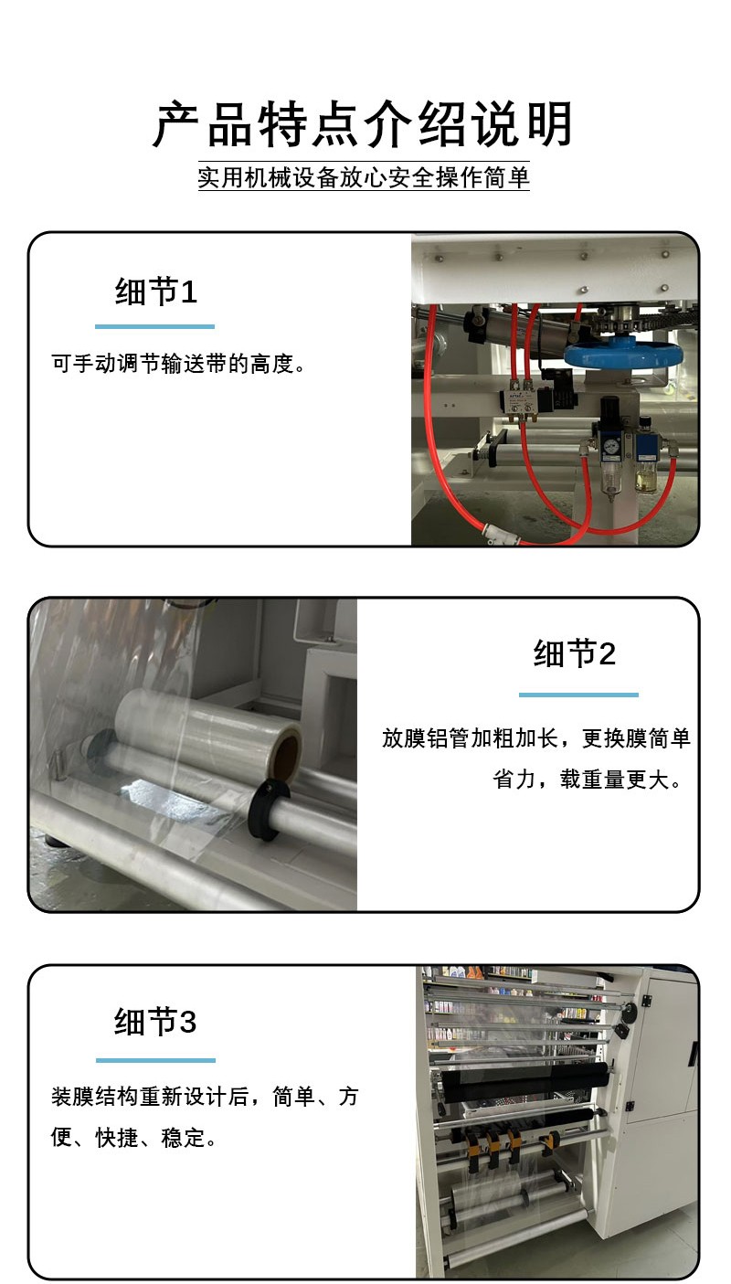 - 自動化程度高:從薄膜輸送、封切到收縮包裝,整個過程全部自動化完成,減少了人工干預,提高了包裝效率。操作人員只需將產品放置在輸送帶上,設備就可以自動進行包裝,并且可以通過控制系統預設包裝參數,實現批量生產。